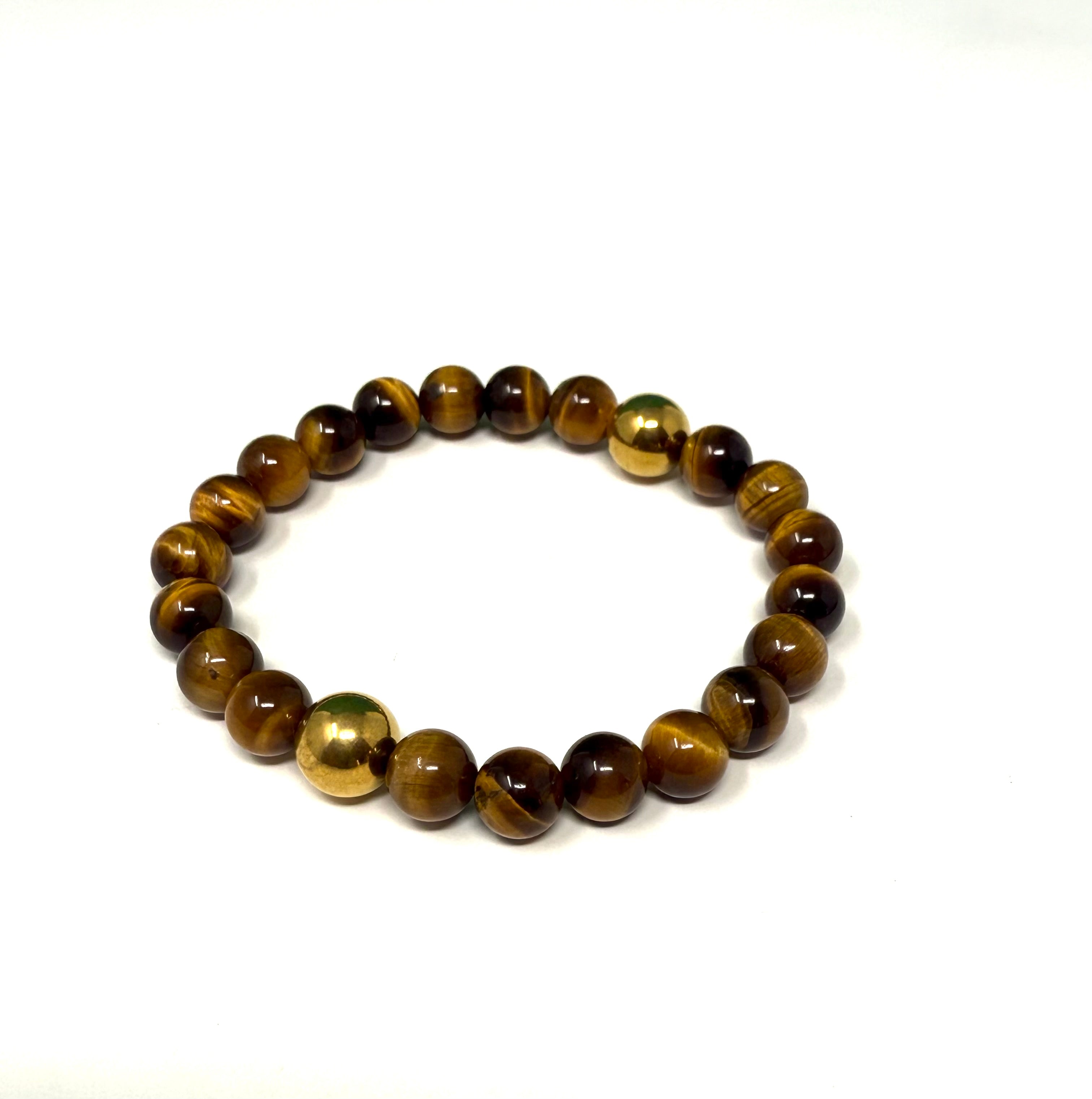 Tiger’s eye beads with golden-brown bands, accented by polished gold stainless steel for a refined look.