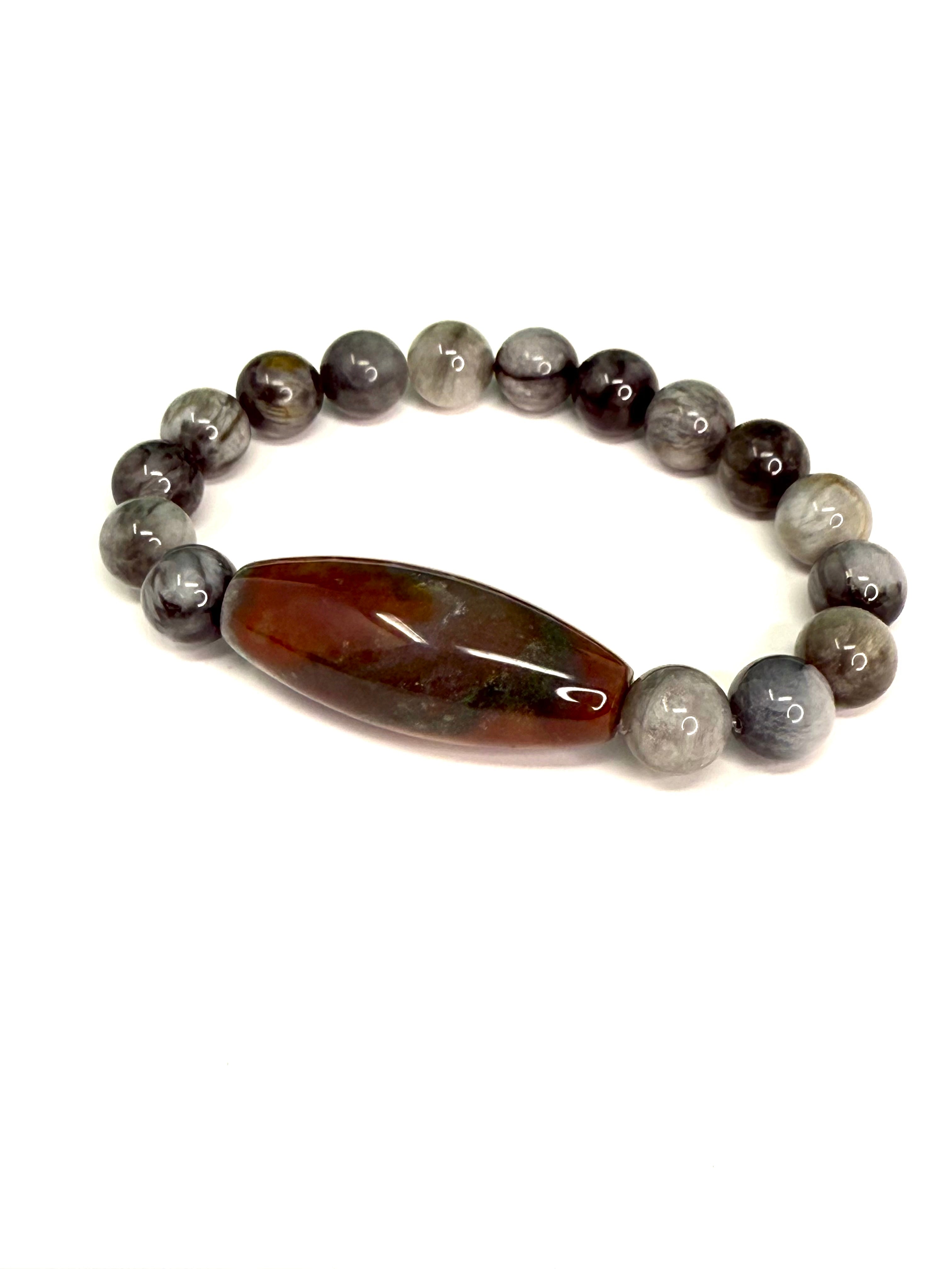 Smooth gray cat’s eye stones reflect a gentle glow, highlighted by burgundy agate accent stone for modern elegance.