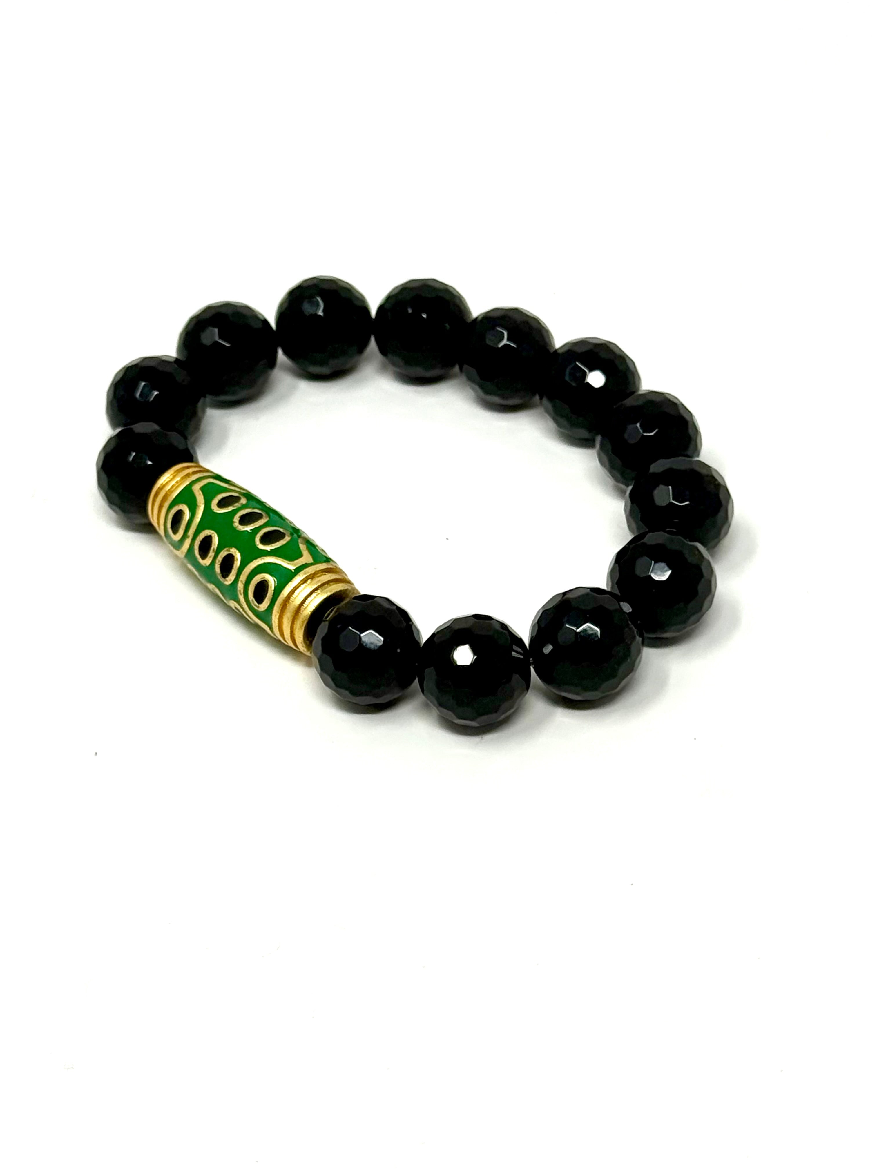 Faceted onyx stones accented with green and gold detail create a bracelet of modern resilience