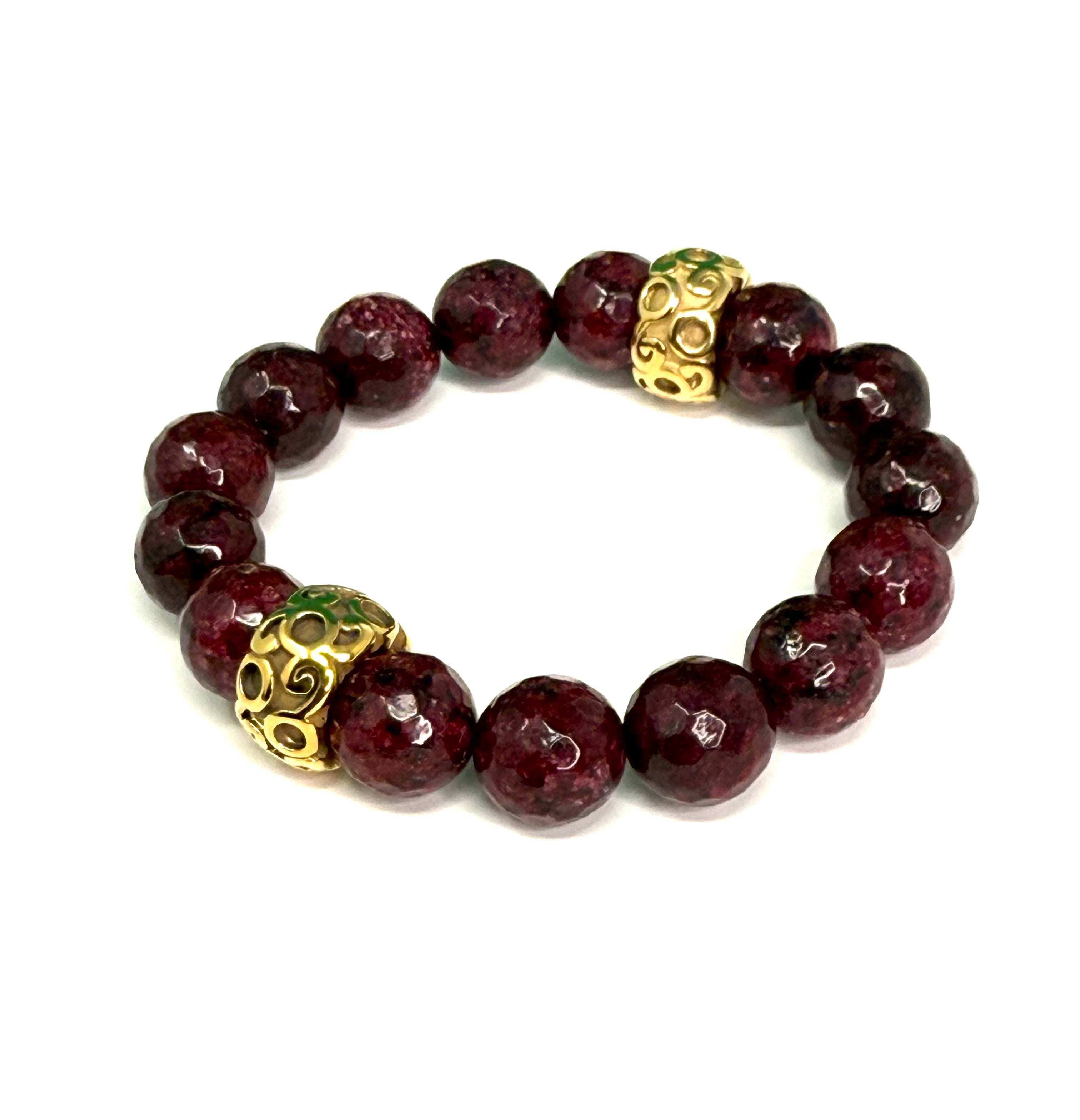 Faceted burgundy jade beads paired with gold stainless steel details deliver a bold yet elegant statement piece.