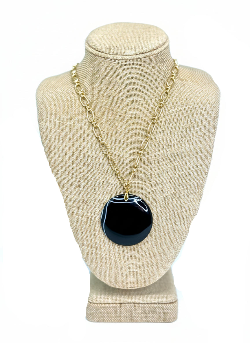 Black and white onyx pendant with gold-plated paperclip chain in a 28.5" necklace of timeless elegance.